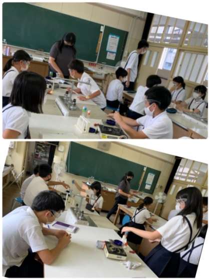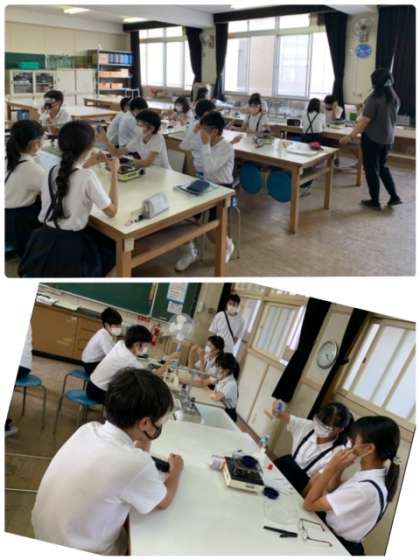 6年1組の理科の時間です。理科室で実験をしています。課題「塩酸に溶けた金属は、どうなったのだろう」について、予想をたてて、実際に実験で確かめています。