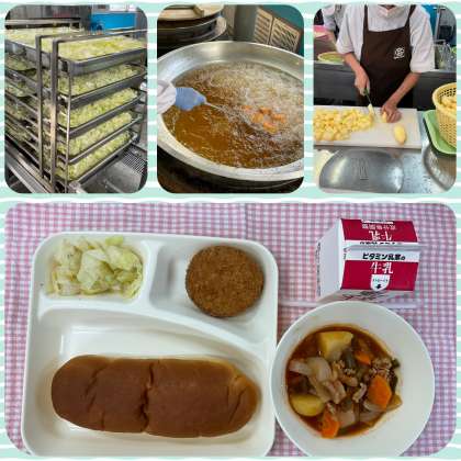 今日の給食は「おさつパン、チキンレバーカツ、ケチャップ煮、キャベツのバジル風味サラダ、牛乳」でした。チキンレバーカツは冷凍の製品ですが、ほんのりカレー味でおいしく食べて、鉄を摂ることもできます。毎回このカツが出るたびに「レバーの風味が気になる子がいるのかな」と気になりますが、今回は、そんな声はほとんど聞かず、そのまま食べたり、パンにはさんだりしておいしそうに食べている子が多かったです。