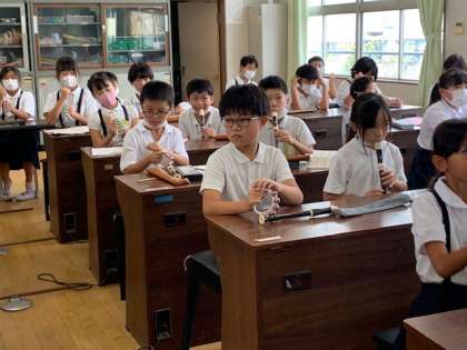 3年生 音楽〜「ゆかいな木きん」を楽しんで演奏しました! 公開日 2022/09/28 更新日 2022/09/28 お知らせ 3年1組の音楽の時間です。クロッケン(小さな鉄琴)やシロフォン(小さな木琴)、リコーダー、タンバリン、鈴、そして、歌とで、曲「ゆかいな木きん」を演奏しました。順番に役割を変えて、全員が、交代で、どの楽器にも挑戦しました。初めてさわる楽器もありましたが、上手に演奏できました。みんなが楽しんでいました。 いいね(0)