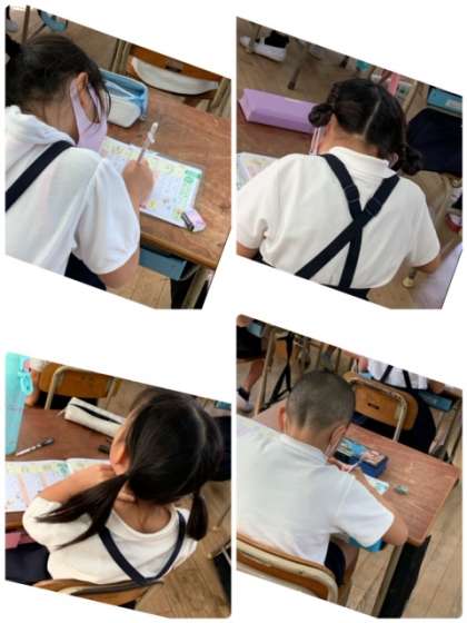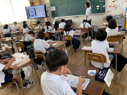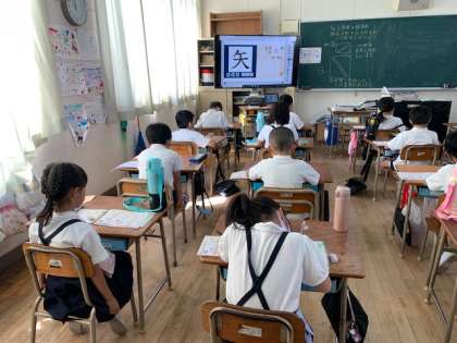 2年1組の国語の時間です。授業のはじめに、漢字の練習帳に取り組んでいます。今日の漢字は「矢」です。早く終わった児童は、次の漢字に注目をしています。覚えた漢字が増えるのが、とても楽しみな様子が伺えました。