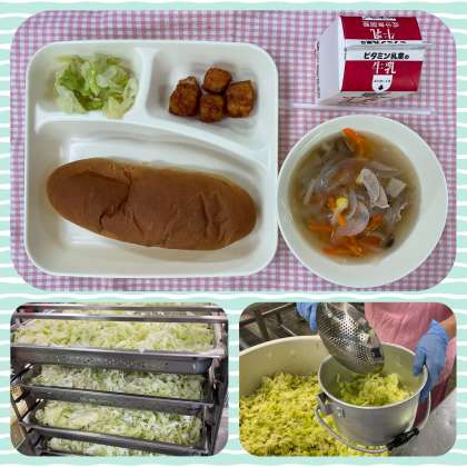 今日の給食は「黒糖パン、まぐろのオーロラ煮、スープ、あっさりキャベツ、牛乳」でした。まぐろのオーロラ煮は大人気メニューです。給食室では仕上げながら「この味は、まちがいない(人気がある味)だね」と。あっさりキャベツは、穴あきホテルパンにキャベツを入れて蒸します。しっかり水分を切って、塩を混ぜ合わせたら完成!シンプルですが食べやすいのでパクパクすすみます。今日はみんながおいしく食べてくれること「まちがいない」献立でした。
