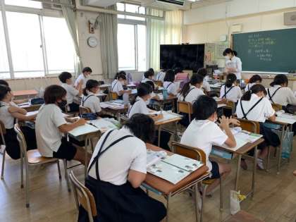 5年1組の社会の時間です。今日の学習のめあては、「多くの食料を輸入にたよっていると起こる問題について調べよう」です。自給率が高いお米でさえ、不作によって足りなくなる時もあると知りました。自分たちの身近な食料についてですが、しっかりと学んで知ることが大切ですね。