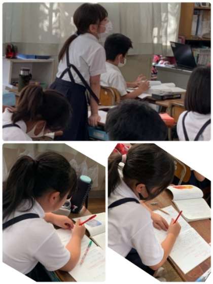 3年1組の国語の時間です。単元「サーカスのライオン」の学習をしています。今日の学習のめあては、「四場面のタイトルを考えよう」です。本文を読んで、「つながり」や「しかけ」について、気づいたことや意見を活発に交流していました。また、先生や友だちの話を聞いて、大切なところをノートに書き込んでいる様子に感心しました。