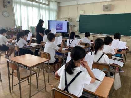 10月5日(金)、6年1組で研究授業を実施しました。6年生は、単元「海のいのち」の学習を進めています。この単元の学習では、児童が、情景描写から人物相互の関係や心情をとらえながら読み、中心人物の気持ちが変化した理由を叙述に基づいて自分の考えをまとめること、そして、他者との交流を通じて、考えを広げたり深めたりしようとすることをめざしています。