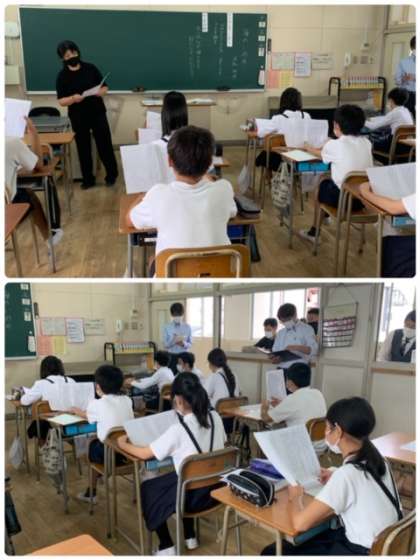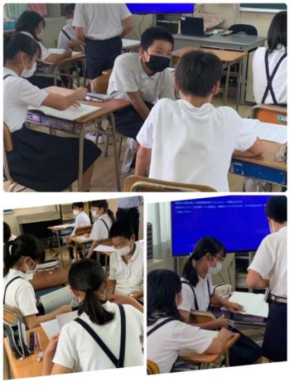 今日の学習のめあては、「太一は、なぜ瀬の主を打たなかったのだろう。」です。授業の初めには、「太一の気持ちが変化したところはどこだろう」と考えながら、本文を音読しました。「太一の気持ちが変化した叙述部分はどこか」、そして「なぜ変化したのだろう」・・と意見交流をしました。最初は一人で考え、次にグループで交流し、最後に全体へ向けて発表しました。外部からお招きした講師先生を含め、たくさんの先生方が見る中での授業ということで、児童たちは緊張していましたが、それでも、自分の考えをしっかりと発表していました。