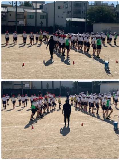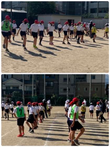 5年生と6年生も、合同で運動会の練習をしました。団体演技でお見せする集団行動「心を一つに」に練習です。少しずつ、体型や動きを練習しています。全員の動きがそろって出来上がる「集団行動」です。練習の成果が楽しみです!