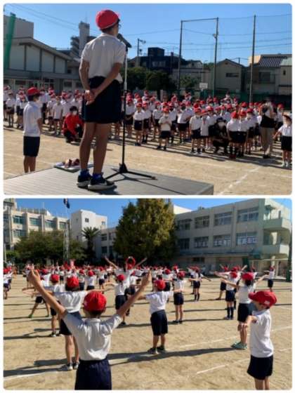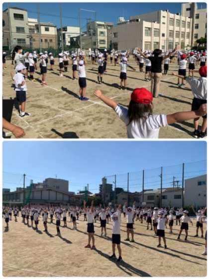 合同体操の練習です。6年生のリーダーの合図で体操を始めます。