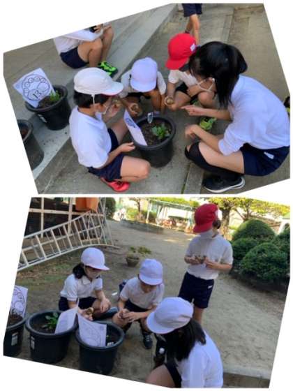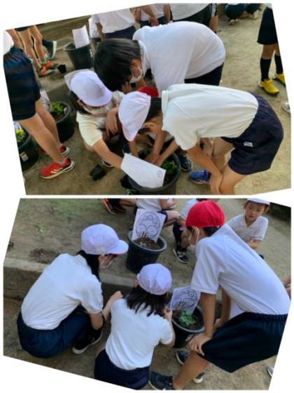 九条北小学校では、グループで苗や球根を植え、草花に興味や関心を持たせるとともに、毎日の世話を通して、観察したり、花を咲かせる喜びを知り、植物を大切に育てようとする気持ちを育てることを目的として、「グループ一鉢活動」を実施しています。
