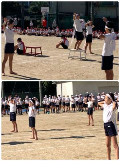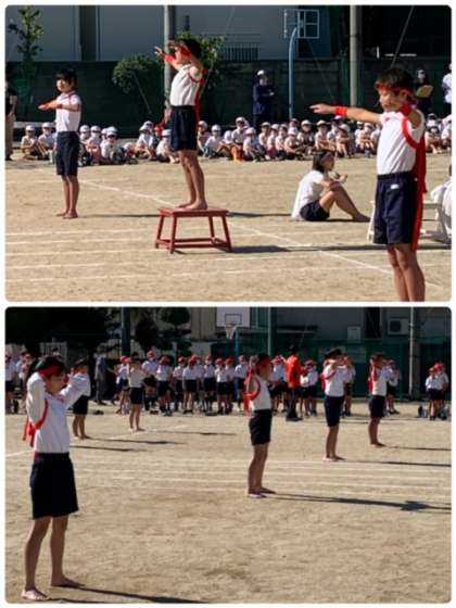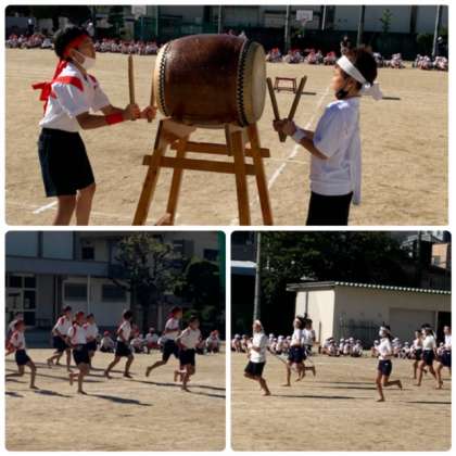 太鼓の合図で、応援団が立ち位置へ移動します。応援団長のかけ声に続いて、応援団が、赤白それぞれの応援を披露してくれます。