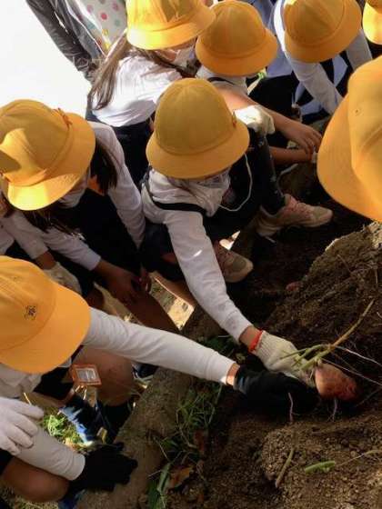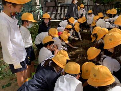 2年生が、学習園で育ててきた「さつまいも」の収穫の時期がやってきました。毎日の水やりやこまめな雑草抜きを、2年生は、かかさず続けていました。そのおかげで、つるもすくすくと伸び、葉もいっぱいつけて、健やかな成長の様子を見せてくれていました。