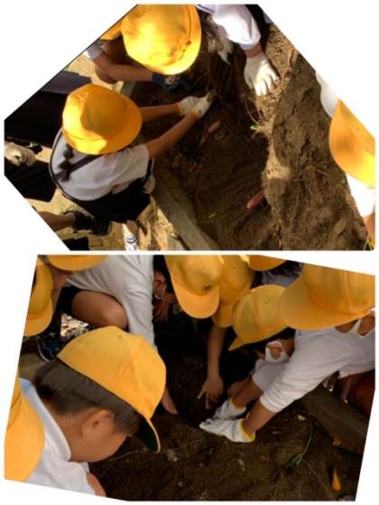 今日は、1・2組合同での「さつまいも」の収穫です。土を掘っていくと・・・「さつまいも」が顔を出してくれます。それを発見して、2年生の表情も、明るく、期待に満ちた様子でした。掘っていくと、とても大きく成長した「さつまいも」が出てきました。2年生の愛情がこもった「さつまいも」です。