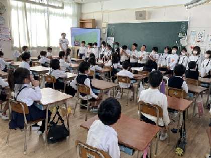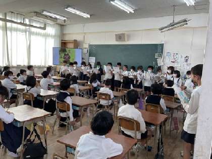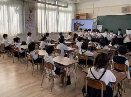 パワーアップタイムの時間に、2年生が1年生の教室へきてくれました。2年生は、国語の学習で、物語文「にゃーご」の学習のまとめとして、デジタル紙芝居を作りました。今日は、その紙芝居を1年生へ披露してくれました。セリフは、2年生が考えたものです。登場人物の気持ちを読み取り考えました。1年生の前で発表するのは緊張しますが、がんばって気持ちを込めて発表してくれました。