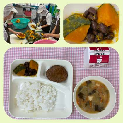 今日の給食は「ごはん、和風ハンバーグ、みそ汁、かぼちゃのいとこ煮、牛乳」でした。和風ハンバーグは、みんな朝からワクワク。私はいとこ煮にワクワク。かぼちゃとあずきをゆっくり煮て味を含ませています。1年生が取りに来た時、見本を見て「先生、かぼちゃの上に何かついてる!」とびっくりした様子。「あずきだよ」と言うと、「あずききらい〜」といいながら教室へ。その後様子を見に行くと、配膳してもらっていて「あずきはきらいだけど・・・」と言いながらも「2粒入れて」と。「ホント?!いらないって言わなかったね。すごいなぁ。食べてみて!」苦手なものでもすすんでチャレンジしてくれた姿に嬉しくなりました。