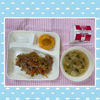 今日の給食は「ピリ辛丼、中華スープ、黄桃(缶)、牛乳」でした。デザートの黄桃は大人気でした。見本を見た時、たくさんの子が「マンゴーや!」と大喜び。「ちがう、ちがう、桃だよ」「わぁ、柿!」「ちがう、ちがう、桃だよ」「これって桃なん?」「桃だよ・・・」こんなやり取りでした。最近は一口サイズにカットされた桃(カット缶)が出ることが多いのですが、今日は1人半切れずつ。なのでボリュームもありました。