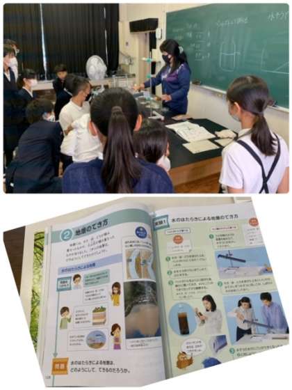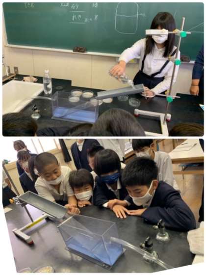 6年1組の理科の時間です。「水のはたらきによる地層のでき方」について実験をしました。最初に、先生から説明を受けた後、班の代表が、順番に、「砂を流す」「水を流す」を繰り返しました。実験のゆくえの興味津々です!
