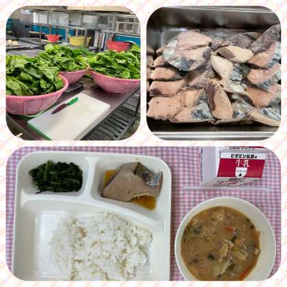1日の給食「ごはん、なまりぶしのしょうが煮、じゃがいものみそ汁、ほうれんそうのおひたし、牛乳」普段食べ慣れないなまりぶしでしたが、ふっくら煮ていて、とても食べやすく仕上がっていました。