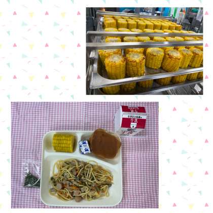 2日の給食「黒糖ロールパン、ウインナーときのこの和風スパゲッティ、焼きとうもろこし、りんご、牛乳」スパゲッティには、しいたけ、しめじがたっぷり入って、秋を感じる味でした。