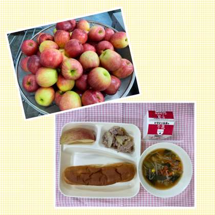 4日の給食「おさつパン、豚肉のオイスターソース焼き、中華みそスープ、りんご、牛乳」中華風ながら赤みその入ったスープは、「めんを入れたいね!」という声をたくさん聞きました。
