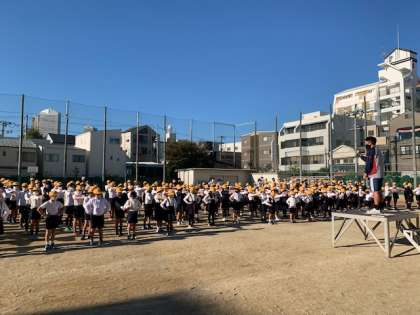 11月7日(月)の児童朝会は、運動場で行いました。最初に、昨日行われた「大阪市各区子ども会対抗親善キックベースボール大会」において、第三位の成績を収めたことを紹介されました。キックベースのメンバーには、表彰状および楯・銅メダルが授与され、全校児童からは拍手を贈りました。西区の代表として、よくがんばった成果です。
