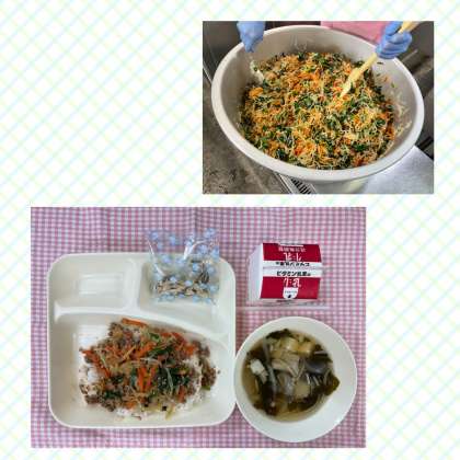 今日の給食は「ビビンバ、わかめスープ、アーモンドフィッシュ、牛乳」でした。ビビンバは大好評メニューです。肉の具と野菜の具をそれぞれごはんにかけていただきます。しっかりめに味付けした野菜は食べやすく、苦手な子でもチャレンジしやすかったようです。色とりどりの野菜がもりもりのビビンバでした。