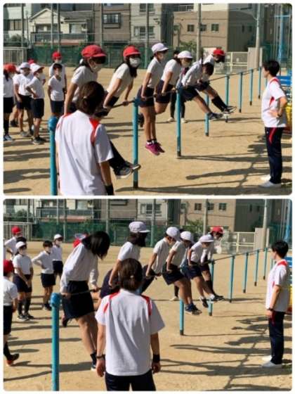 6年生の体育の時間です。西区の教育施策の1つとして、プロのインストラクターを派遣していただきました。今回は、鉄棒を使った運動です。まずは、「つばめの姿勢」という体勢をつくるのを10回しました。鉄棒運動をした人から、別の場所で、コーンからコーンへ後ろ向きに進む運動もしました。全員できたら、次は、「つばめの姿勢」からくるりと回転します。タイミングと腕の力が必要のようですね!