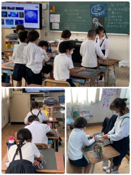 2年生 図工〜いろいろな線でかこう! 公開日 2022/11/15 更新日 2022/11/15 お知らせ 2年1組の図工の時間です。白の絵の具で描いたクラゲに、色ペンを使って、いろいろな線を足したり、吸盤を描いています。オリジナルのクラゲの絵ができていきます!楽しみですね! いいね(0)