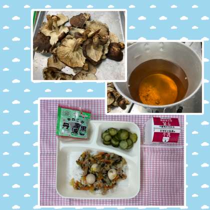 今日の給食は「中華丼、きゅうりのピリ辛あえ、ソフト黒豆、牛乳」でした。中華丼はうま味をアップするために、干ししいたけのもどし汁も加えました。干ししいたけには、三大うま味成分のうちのひとつ「グアニル酸」が含まれています。ほかの2つは、こんぶの「グルタミン酸」とかつおぶしの「イノシン酸」です。グアニル酸は、ほぼ干ししいたけからしか取れないそうです。しかも生のしいたけではほとんど含まれないとか!きょうはグアニル酸、たっぷりいただきました。