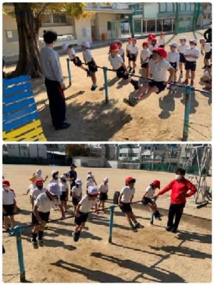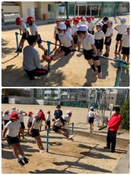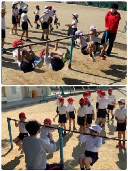 3年生に続いて、2年生も、プロのインストラクターの方に指導していただきました。最初に、「順手」の持ち方の説明を、そして、「順手で鉄棒を握って、体を持ち上げる動作」をしました。最初は5回、次は10回と、回数を増やして挑戦しました。続いては、「つばめの姿勢〜後ろ側に振り子のように体を振り出します」に挑戦しました。「みんな上手だね!」とほめてもらっていました。
