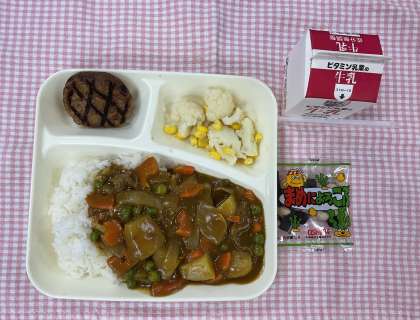 11月25日の給食は「ハンバーグカレーライス、カリフラワーのピクルス、豆こんぶ、牛乳」でした。ミニハンバーグがついて、子どもたちは大喜びでした。