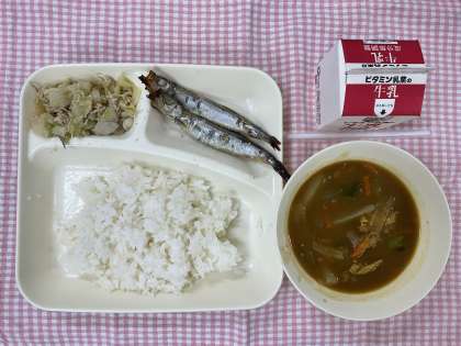 11月29日は「焼きししゃも、和風カレー汁、まいたけとキャベツのいためもの、牛乳」でした。カレー汁は冷めにくく、体が温まる汁物でした。