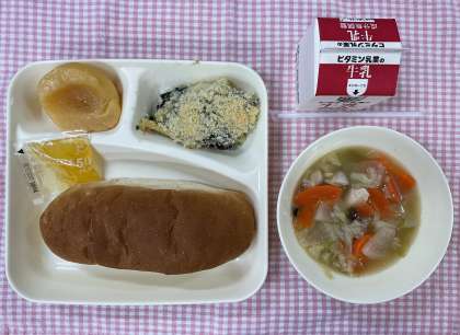 11月30日は「コッペパン、ほうれんそうのグラタン、スープ煮、白桃(缶)、マーマレード、牛乳」グラタンだとほうれんそうもパクパク食べることができました。