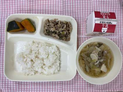 12月1日の給食は「ごはん、豚肉と干しずいきのみそ煮、うすくず汁、焼きかぼちゃの甘みつかけ、牛乳」でした。干しずいき(さといもの葉柄)は、普段食べなれない食材でしたが、柔らかく煮ていて、とてもおいしい仕上がりでした。