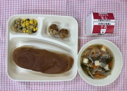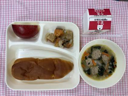 2日は「おさつパン、さけのマリネ、肉だんごと麦のスープ、りんご、牛乳」でした。スープに入っている押し麦のプチプチ感が好評!