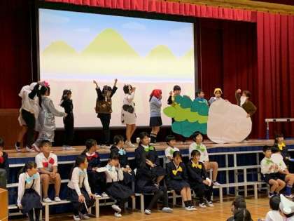 学習発表会〜練習の成果を発揮して、みんなで成功させよう! 公開日 2022/12/07 更新日 2022/12/07 お知らせ 5年生の発表は、英語劇「THE GIANT TURNIP (おおきなかぶ)」です。全員が英語のせりふに挑戦しました。劇中では、英語のセリフやナレーションと合わせて、日本語訳でも伝えてくれました。実際の「大きなかぶ」より、たくさんの助っ人(動物たち」も登場し、動物たちの鳴き声も英語で表現してくれました。難しい英語劇に取り組んだ5年生のチャレンジは、すばらしいですね。 いいね(0)
