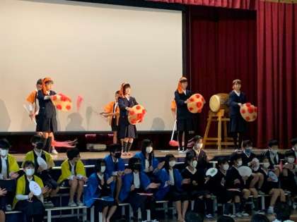 最後の発表は、6年生による「北小フェスティバル」です。オープニングは、みんなの良く知っているディズニー曲に合わせて、左右から側転で登場!わくわくした気持ちにさせてくれました。そして、6年生は、日本の祭りについて調べたものをパワーポイントで紹介しながら、実際に舞台で見せてくれました。最後は、全員による「ソーラン節」で、会場全体を元気パワーで包み込んでくれました。