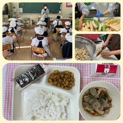 今日の献立は「ごはん、筑前煮、じゃこ豆、焼きのり、牛乳」でした。筑前煮には、ごぼう、れんこん、こんにゃく。じゃこ豆には大豆、ちりめんじゃこなど、噛み応えのある食材がたくさん入った献立でした。大豆にでんぷんをまぶして油で揚げ、甘辛い味付けしたちりめんじゃこと合わせたじゃこ豆は大好評!自然とよく噛んで食べることができたかと思います。明日はお正月の献立で、みそ仕立てのぞう煮が登場です。