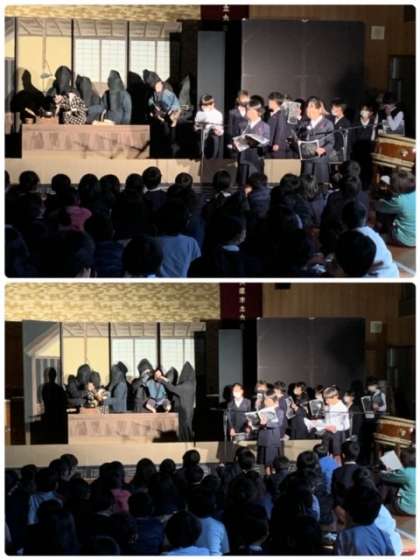 第1幕は、新作「モチモチの木」です。「モチモチの木」は、3年生が国語の時間に学習した物語です。ということで、3年生児童も、「語り手」として参加させていただきました。3年生は、緊張しながらも、学習した登場人物の心情などを声の抑揚などで表現していました。舞台のクライマックスでは、合唱もさせていただきました。3年生にとっては、とても良い経験となりました。ありがとうございます。