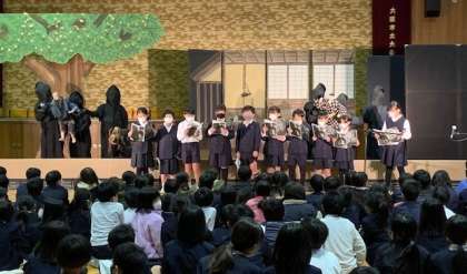 12月21日(水)、勘緑さんが主宰する人形座「木偶舎」の皆さんと和太鼓ユニット「光」の皆さんが、九条北小学校の1〜3年生のために舞台を見せてくださいました。