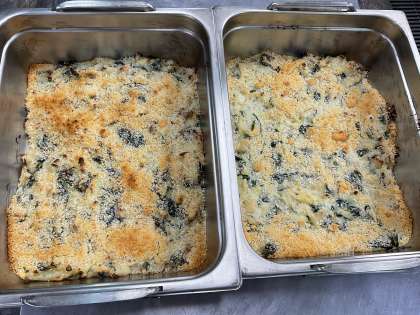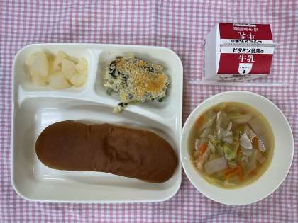 13日の給食は「黒糖パン、ほたて貝のグラタン、スープ、洋なし(カット缶)、牛乳」でした。グラタンは、やはり焼き目があると見た目も食感もおいしさもアップします。なので、ほどよい焼き目をつけて仕上げてもらいました。