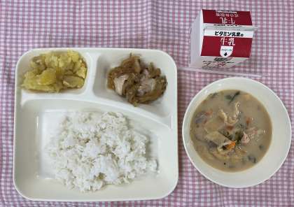 19日の給食は「ごはん、鶏肉の甘辛焼き、かす汁、くりきんとん、牛乳」でした。かす汁は、だしで野菜やさけを煮て、酒かす、みそ、しょうゆで味付けして仕上げています。教室に行って、かす汁の話をしていると、「先生、きょうはさけ(鮭)とさけ(酒かす)やね」と子どもが言いました。「ほんまや!Wさけやね!」「ほんまやぁ〜」とちょっと盛り上がる場面も(^-^)