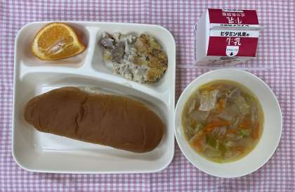 今日の給食は「黒糖パン、押麦のグラタン、豚肉と野菜のスープ、いよかん、牛乳」でした。グラタンは押麦のプチプチした食感がよく、味も大好評。デザートのいよかんは、外の皮がやや厚めなので、むくのに少し時間がかかりました。それでも季節の果物なので、まずは一口食べてみてねと声かけしていきました。2月はいよかんの他に、デコポンやいちごが登場する予定です。