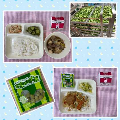 14日の給食は「ごはん、すき焼き煮、もやしとささみのいためもの、きゅうりのゆず風味、牛乳」でした。すき焼き煮は、ごはんに合う、大人気メニューです。ごはんにかけたい!という子もたくさんいました。