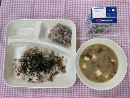 27日の給食は「鶏ごぼうご飯、とうふのみそ汁、焼きれんこん、牛乳」でした。写真は私が食べる前に混ぜてしまったのですが、鶏ごぼうの具は、教室で白ご飯の上にかけて、自分で混ぜていただきました。袋入りのきざみのりを食べるときにパラパラ。シンプルに塩だけで味つけの焼きれんこんは、人気メニューです。