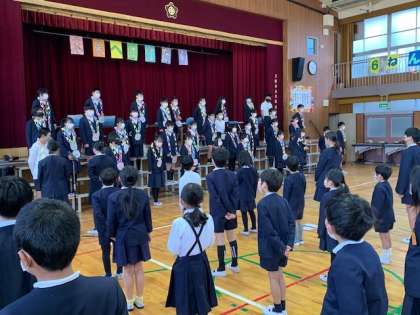 次はプレゼント交換です。6年生へ、1年生から「メダル」を、2年生から「メッセージカード」を送りました。そして、1年生〜5年生全員で「ありがとうの花」のプレゼント!6年生からも、手作りのプレゼントが各学級の代表へ手渡されました。そして、歌「大切なもの」と合奏「情熱大陸」もプレゼント!!