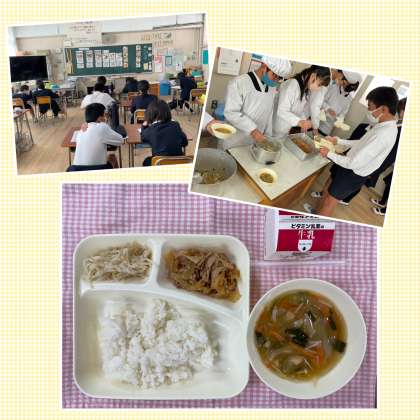 今日の給食は「ごはん、豚肉のコチジャンいため、鶏肉とはるさめのスープ、もやしのナムル、牛乳」でした。今日は4時間目に栄養指導に行き、そのまま給食の配膳の様子も見ていたのですが、スープのはるさめをすくうのがなかなか難しいようでした。当番の子に「はるさめも入れてあげて〜」と声をかけると「なんか難しい〜」と。大人気のスープですが、配膳は難しかったようです。