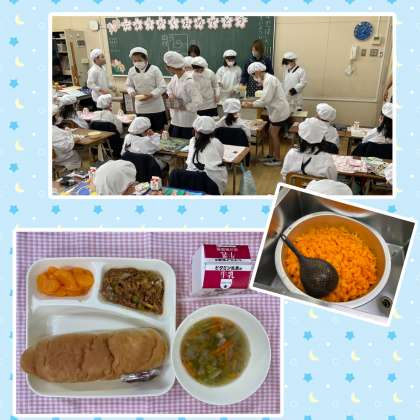今日の給食は「コッペパン、じゃがいものミートグラタン、レタスのスープ、みかん(缶)、いちごジャム、牛乳」でした。ケチャップ味のグラタンは、みんなに大好評!スープのレタスはコーンも入り、色どりもきれいでした。今日はパンにつけるジャムがありましたが、ミートグラタンもはさみたい子が何人もいて、半分はジャム、残りはグラタンをはさんで食べる様子も見られました。6年生は今日も1年生のお手伝い。ありがとう!