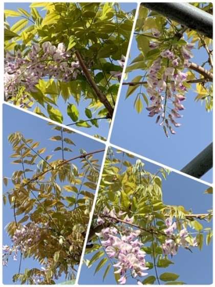 九条北小学校の中庭にある「藤棚」・・・ご存じですか?テーブルとベンチのある場所です。その「藤の花」の開花が始まりました。まだ少しですが、藤の花が増えると、きれいな藤棚の姿を見せてくれます。