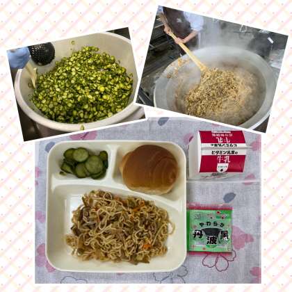 17日の給食〜あっという間に〜 公開日 2023/04/17 更新日 2023/04/17 給 食 今日の給食は「黒糖ロールパン、焼きそば、きゅうりのしょうがづけ、ソフト黒豆、牛乳」でした。焼きそばはソース味。みんなに大人気でした。教室に様子を見に行くと、みんなあっという間に食べて「ごちそうさま!」「もう食べ終わったよ!」と。きゅうりもさっぱり食べやすく、好評の献立でした。 いいね(0)