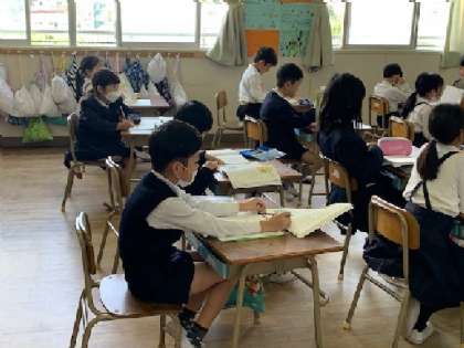 2年2組の国語の時間です。単元「風のゆうびんやさん」の学習をしています。今日は、第5場面「くもに手紙をとどけるばめん」の本文を読んで、文章で表現されている場面の様子を思い描いて、みんなで想像を広げています。