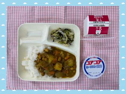 2日の給食は「牛肉と大豆のカレーライス、キャベツのひじきドレッシング、ヨーグルト、牛乳」でした。蒸した大豆もコロコロ入っているカレーですが、毎回大人気です。もちろんラッキーにんじんもたくさん入っていました。